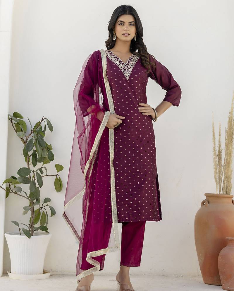 • Product Id : 4712747 • Package Details : 1 Top/1 Bottom/1 Dupatta • Type : Kurta Sets • Work : Embroidered • Look : Designer • Sleeve : Quarter Sleeve • Neck Style : V Neck • Fabric : Chanderi • Color : Purple • Stitching : Stitched Payments [+]