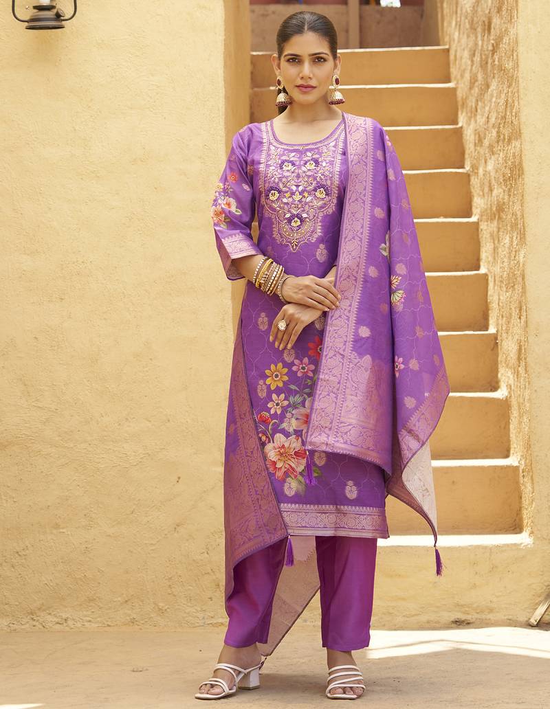 • Product Id : 4703108 • Package Details : 1 Top/1 Bottom/1 Dupatta • Type : Kurta Sets • Work : Embroidered • Look : Designer • Sleeve : Quarter Sleeve • Neck Style : Round Neck • Color : Purple • Fabric : Silk Blend • Stitching : Stitched Payments [+]