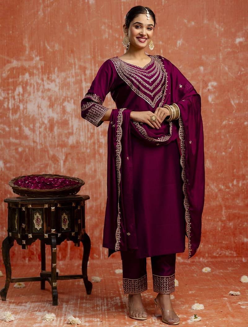 • Product Id : 4712713 • Package Details : 1 Top/1 Bottom/1 Dupatta • Type : Kurta Sets • Work : Embroidered • Look : Designer • Sleeve : Quarter Sleeve • Neck Style : V Neck • Color : Purple • Fabric : Faux Viscose Rayon • Stitching : Stitched Payments [+]