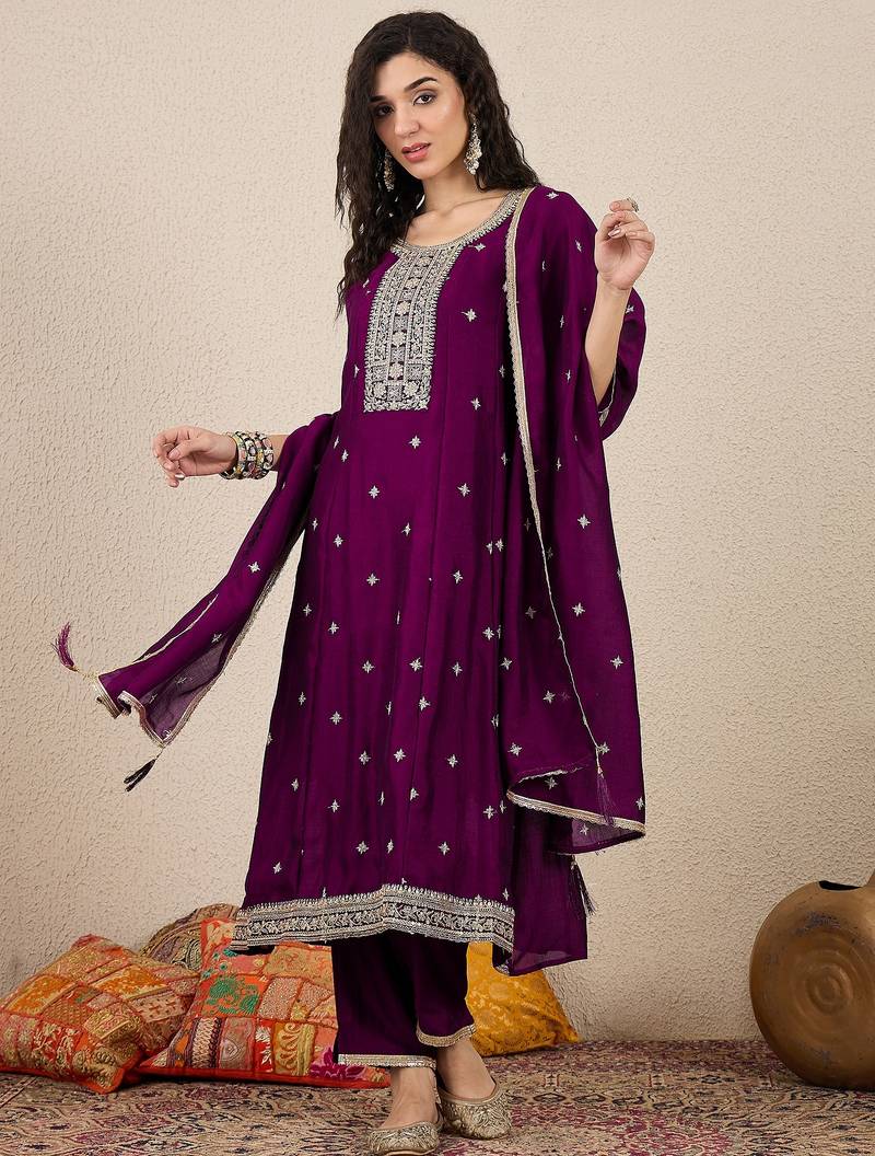 • Product Id : 4702971 • Package Details : 1 Top/1 Bottom/1 Dupatta • Type : Kurta Sets • Work : Embroidered • Look : Designer • Sleeve : Quarter Sleeve • Neck Style : Round Neck • Color : Purple • Fabric : Silk Blend • Stitching : Stitched Payments [+]