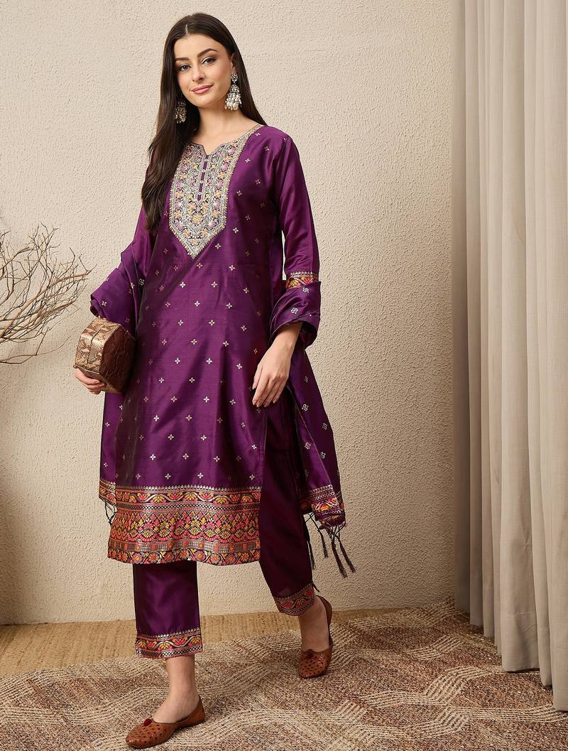 Purple Women Kurta Pant Dupatta Set Stitched
