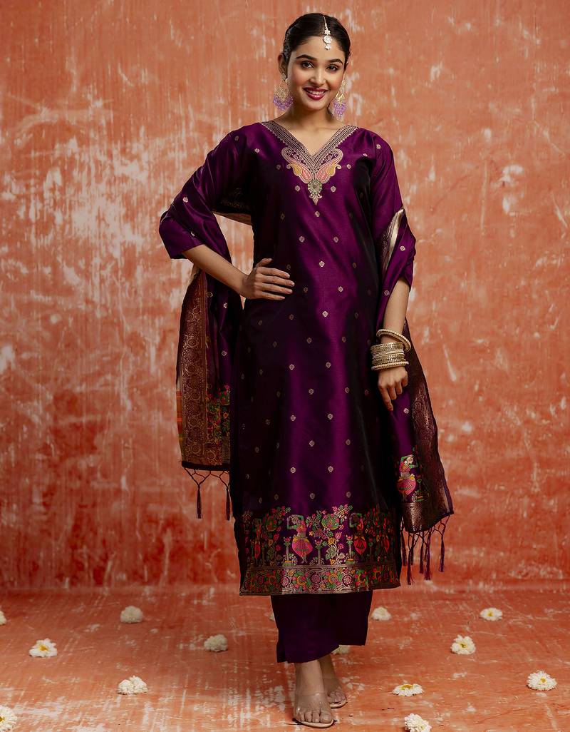 Purple Women Kurta Pant Dupatta Set Stitched