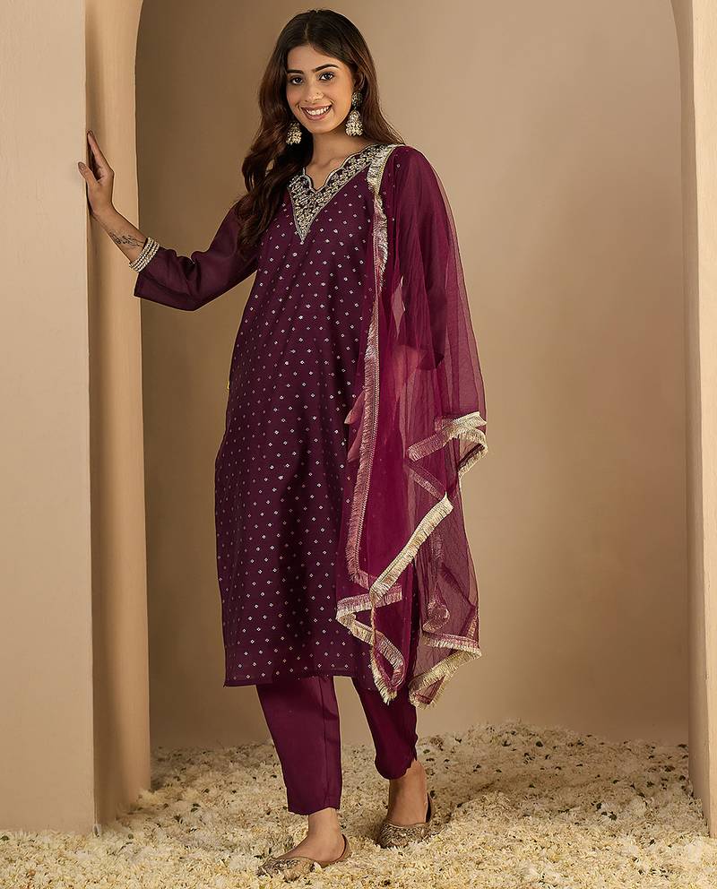 Purple Women Kurta Pant Dupatta Set Stitched