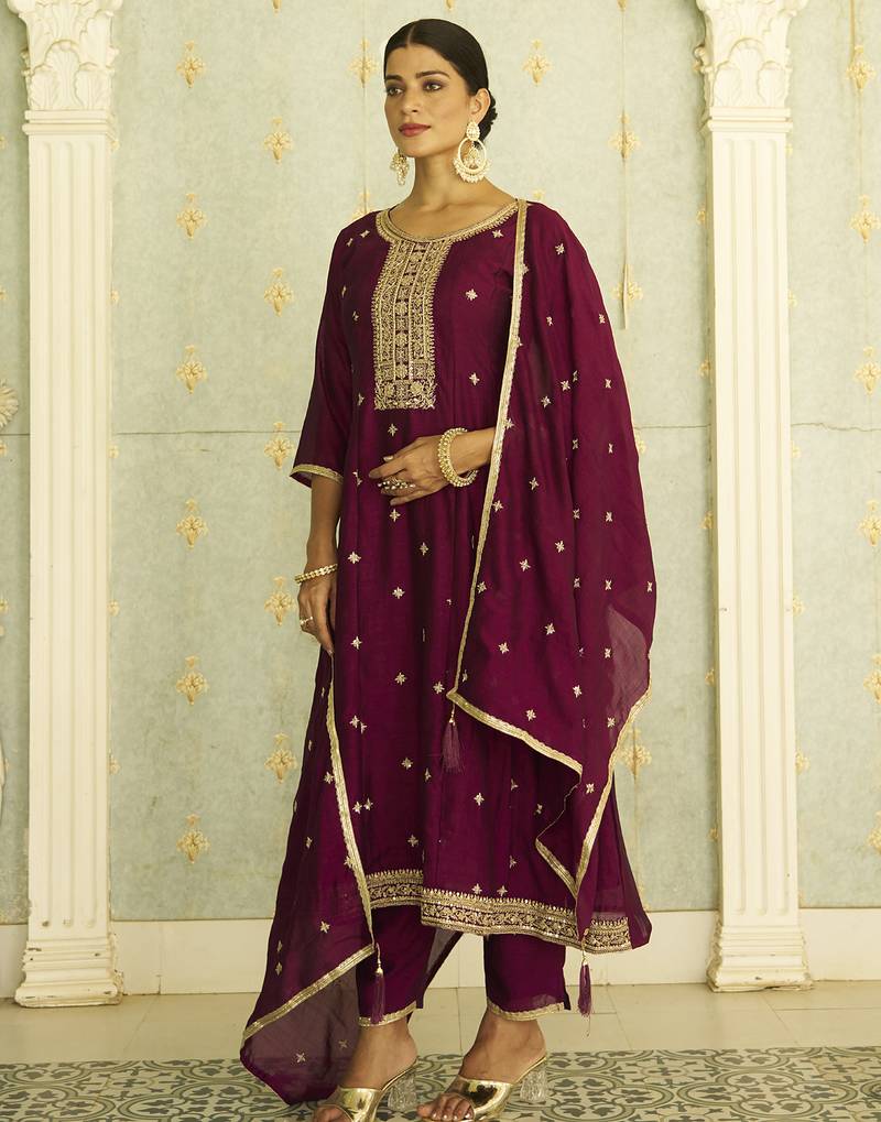 • Product Id : 4702967 • Package Details : 1 Top/1 Bottom/1 Dupatta • Type : Kurta Sets • Work : Embroidered • Look : Designer • Sleeve : Quarter Sleeve • Neck Style : Round Neck • Color : Purple • Fabric : Silk Blend • Stitching : Stitched Payments [+]