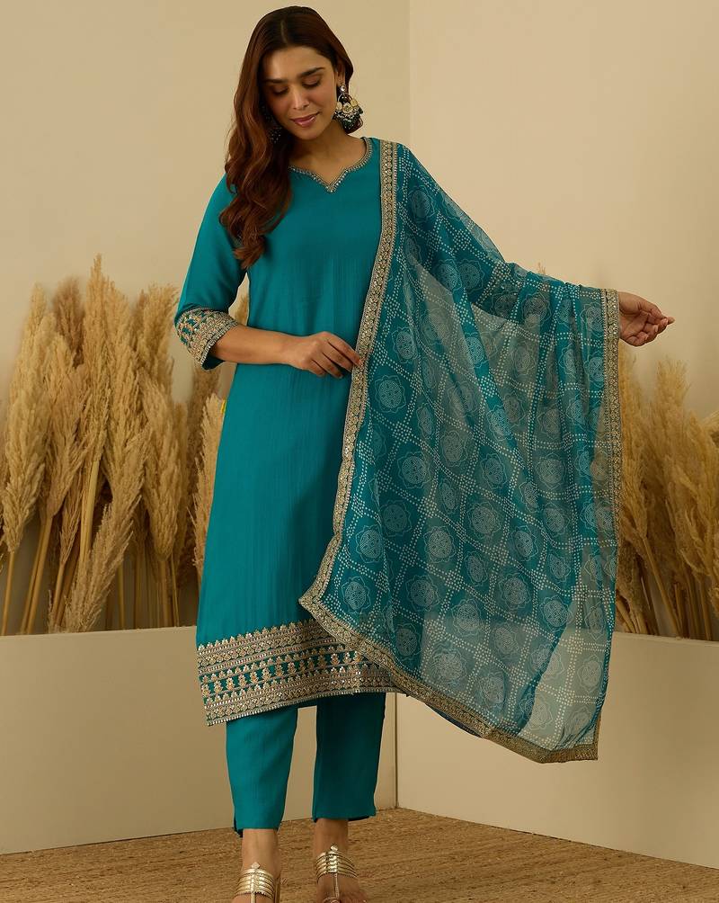 • Product Id : 4698341 • Package Details : 1 Top/1 Bottom/1 Dupatta • Type : Kurta Sets • Work : Embroidered • Sleeve : Quarter Sleeve • Neck Style : V Neck • Occasion : Formal • Color : Teal • Fabric : Silk Blend • Stitching : Stitched Payments [+]