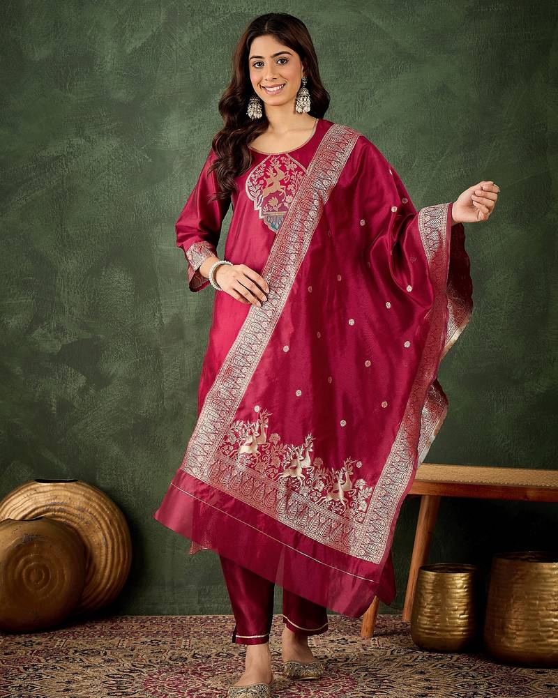 • Product Id : 4701430 • Package Details : 1 Top/1 Bottom/1 Dupatta • Type : Kurta Sets • Work : Woven • Look : Designer • Sleeve : Quarter Sleeve • Neck Style : Round Neck • Occasion : Formal • Color : Red • Fabric : Silk Blend • Stitching : Stitched Payments [+]