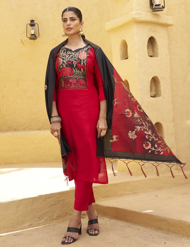 • Style : Trouser • Color : Red • Fabric : Silk Blend • Color : Red Dupatta Details