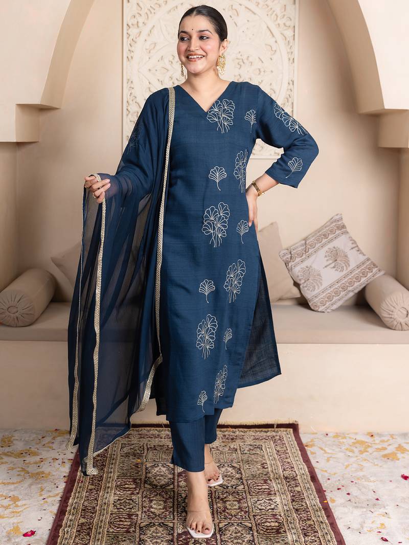 • Product Id : 4698337 • Package Details : 1 Top/1 Bottom/1 Dupatta • Type : Kurta Sets • Work : Embroidered • Sleeve : Quarter Sleeve • Neck Style : V Neck • Occasion : Formal • Color : Teal • Fabric : Faux Viscose Rayon • Stitching : Stitched Payments [+]