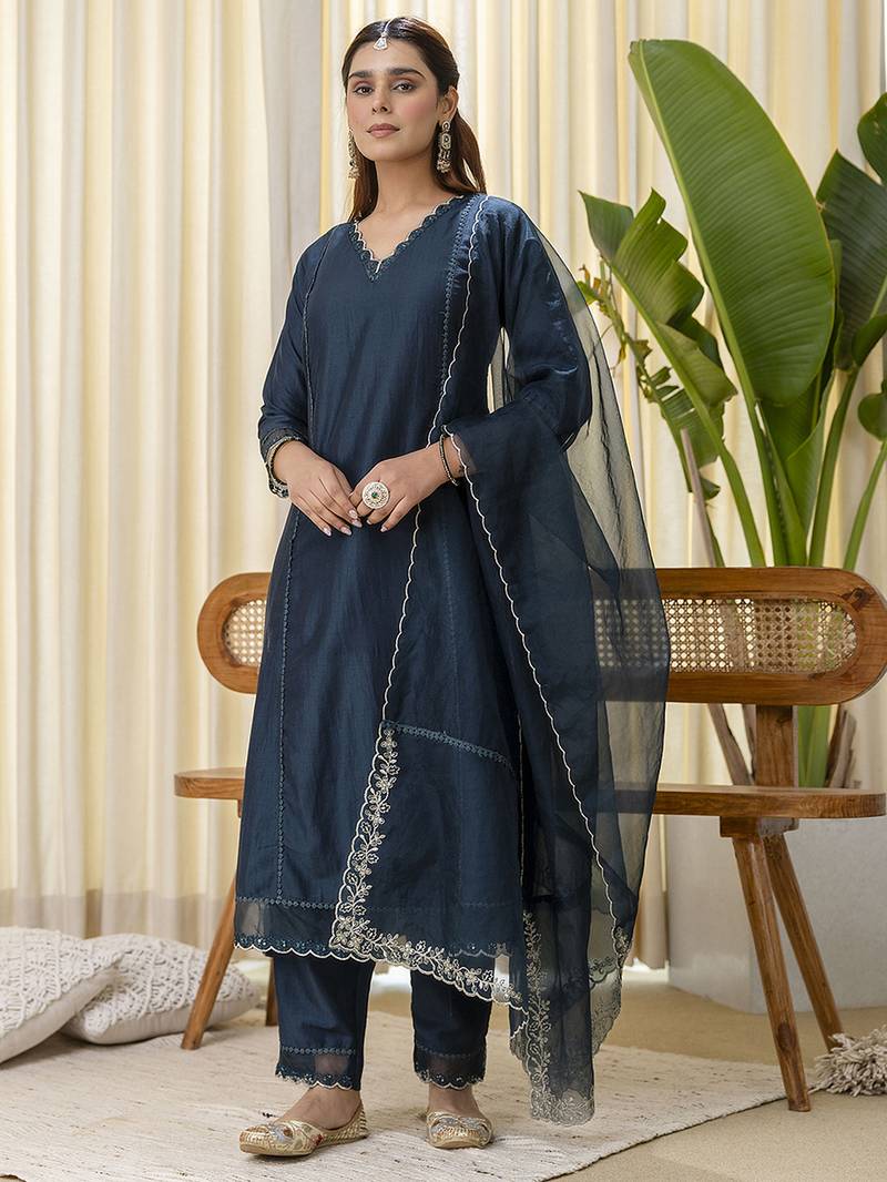 • Product Id : 4696725 • Package Details : 1 Top/1 Bottom/1 Dupatta • Type : Kurta Sets • Work : Embroidered • Sleeve : Quarter Sleeve • Neck Style : V Neck • Occasion : Formal • Color : Teal • Fabric : Silk Blend • Stitching : Stitched Payments [+]