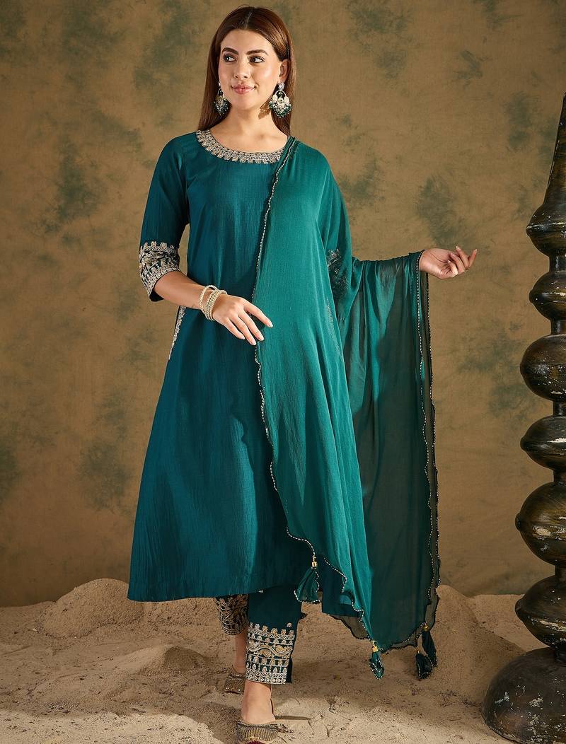 • Product Id : 4698361 • Package Details : 1 Top/1 Bottom/1 Dupatta • Type : Kurta Sets • Work : Embroidered • Sleeve : Quarter Sleeve • Neck Style : Round Neck • Occasion : Formal • Color : Teal • Fabric : Silk Blend • Stitching : Stitched Payments [+]