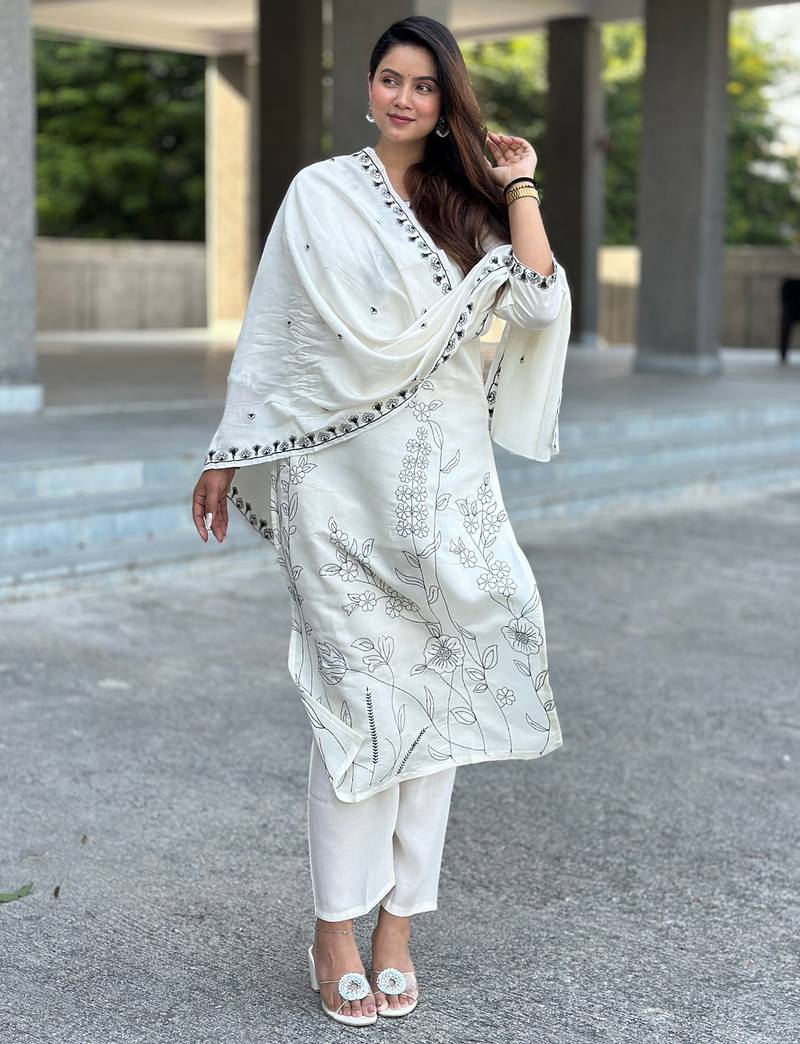 White Women Kurta Pant Dupatta Set Stitched
