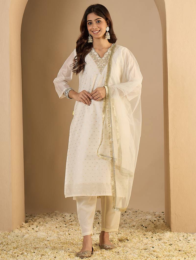 • Product Id : 4712749 • Package Details : 1 Top/1 Bottom/1 Dupatta • Type : Kurta Sets • Work : Embroidered • Look : Designer • Sleeve : Quarter Sleeve • Neck Style : V Neck • Fabric : Chanderi • Color : White • Stitching : Stitched Payments [+]