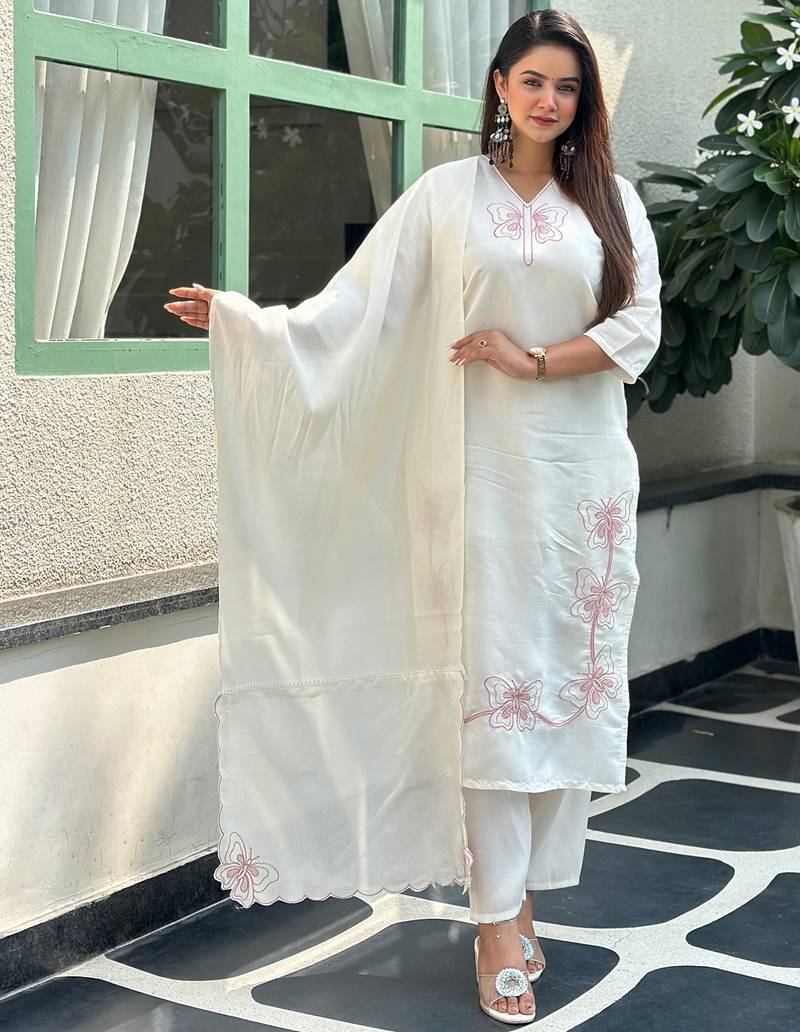 • Product Id : 4696720 • Package Details : 1 Top/1 Bottom/1 Dupatta • Type : Kurta Sets • Work : Embroidered • Sleeve : Quarter Sleeve • Neck Style : V Neck • Occasion : Formal • Color : White • Fabric : Silk Blend • Stitching : Stitched Payments [+]