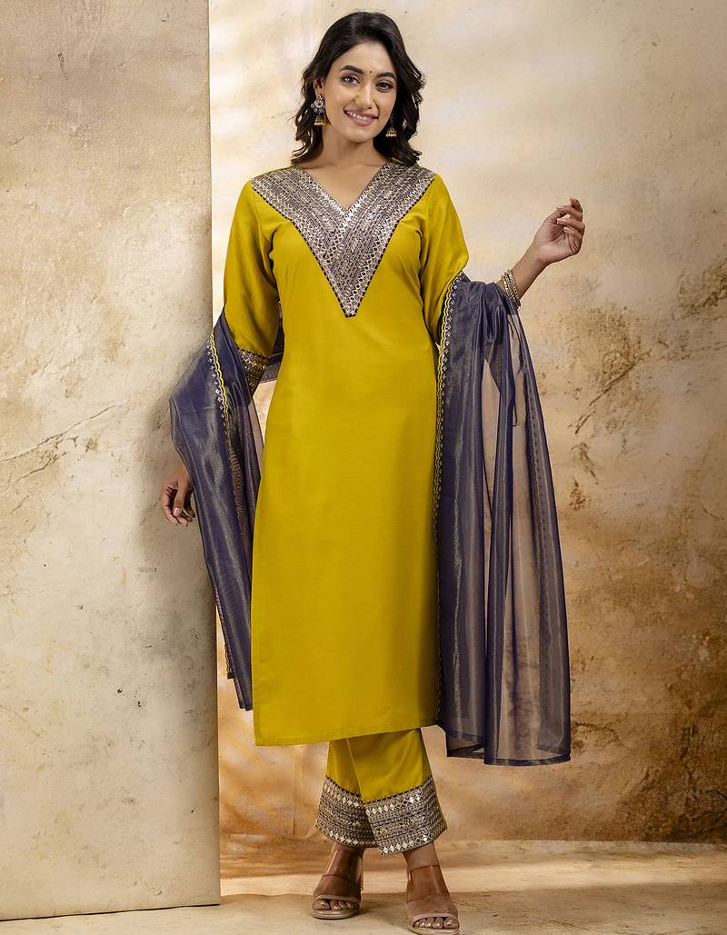 • Product Id : 4696260 • Package Details : 1 Top/1 Bottom/1 Dupatta • Type : Kurta Sets • Work : Embroidered • Sleeve : Quarter Sleeve • Neck Style : V Neck • Occasion : Formal • Fabric : Viscose Rayon • Color : Lemon • Stitching : Stitched Payments [+]