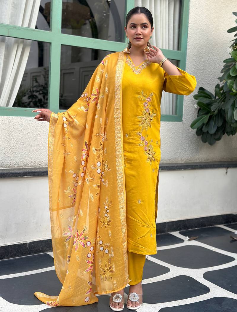 • Product Id : 4696718 • Package Details : 1 Top/1 Bottom/1 Dupatta • Type : Kurta Sets • Work : Embroidered • Sleeve : Quarter Sleeve • Neck Style : V Neck • Occasion : Formal • Color : Yellow • Fabric : Silk Blend • Stitching : Stitched Payments [+]