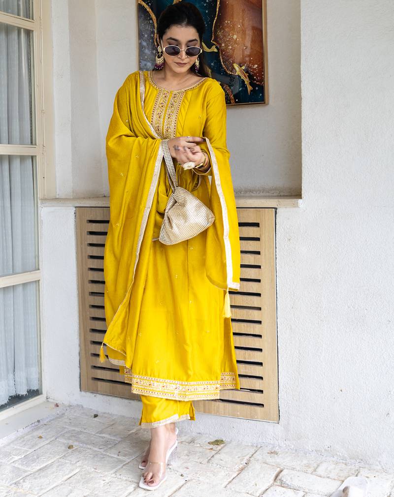 • Product Id : 4702997 • Package Details : 1 Top/1 Bottom/1 Dupatta • Type : Kurta Sets • Work : Embroidered • Look : Designer • Sleeve : Quarter Sleeve • Neck Style : Round Neck • Color : Yellow • Fabric : Silk Blend • Stitching : Stitched Payments [+]