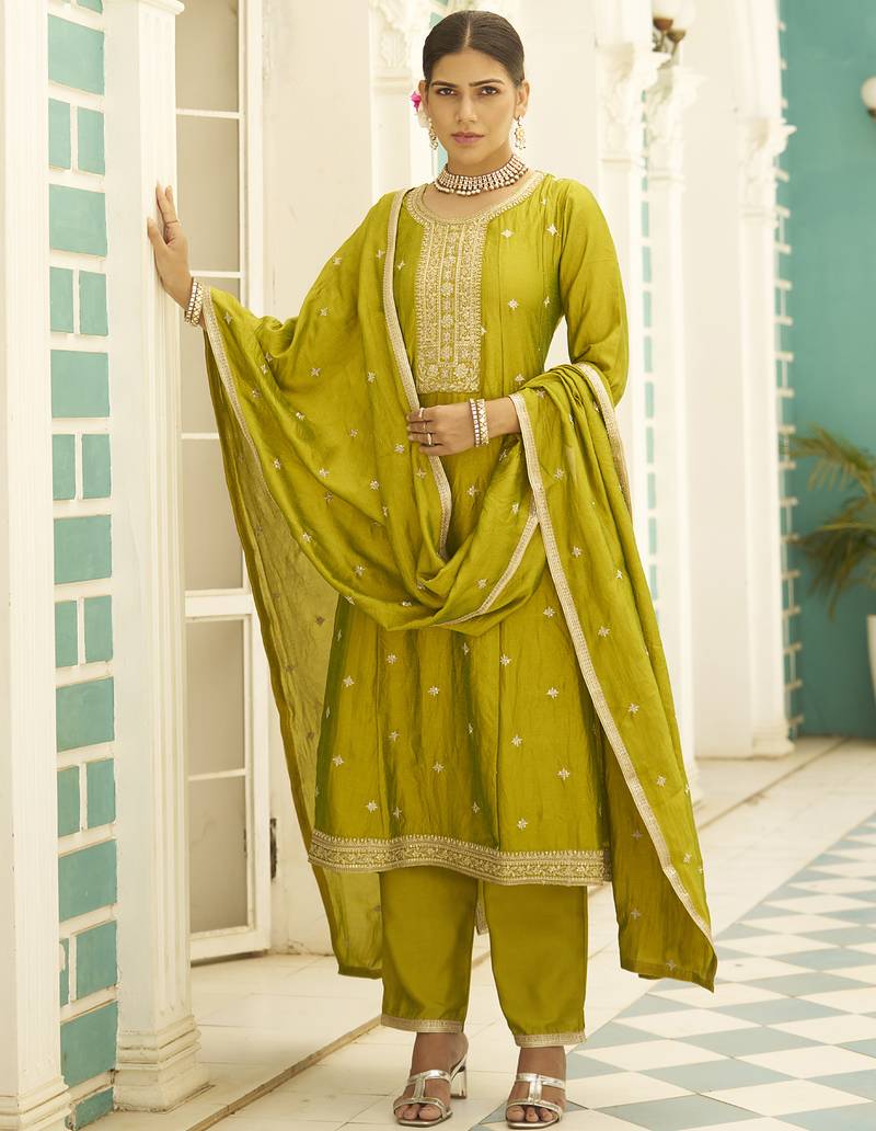 • Product Id : 4702966 • Package Details : 1 Top/1 Bottom/1 Dupatta • Type : Kurta Sets • Work : Embroidered • Look : Designer • Sleeve : Quarter Sleeve • Neck Style : Round Neck • Color : Yellow • Fabric : Silk Blend • Stitching : Stitched Payments [+]