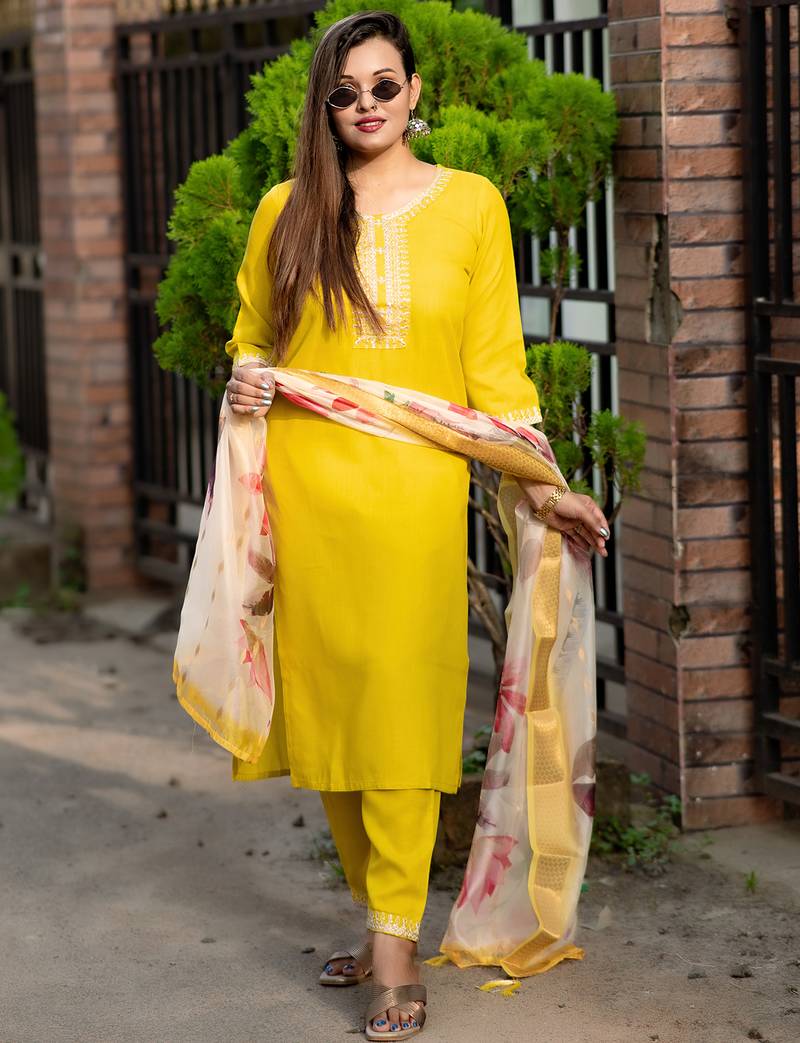 Yellow Women Kurta Pant Dupatta Set Stitched