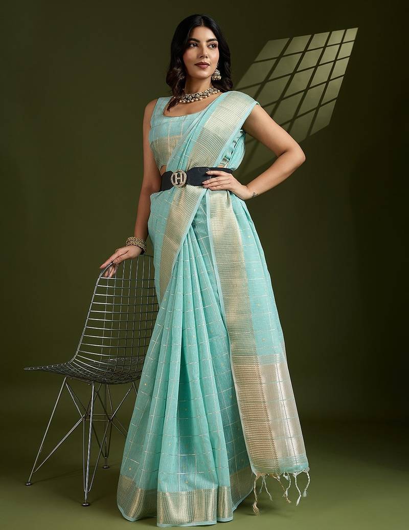 Aqua Blue Solid Tissue Saree With Blouse