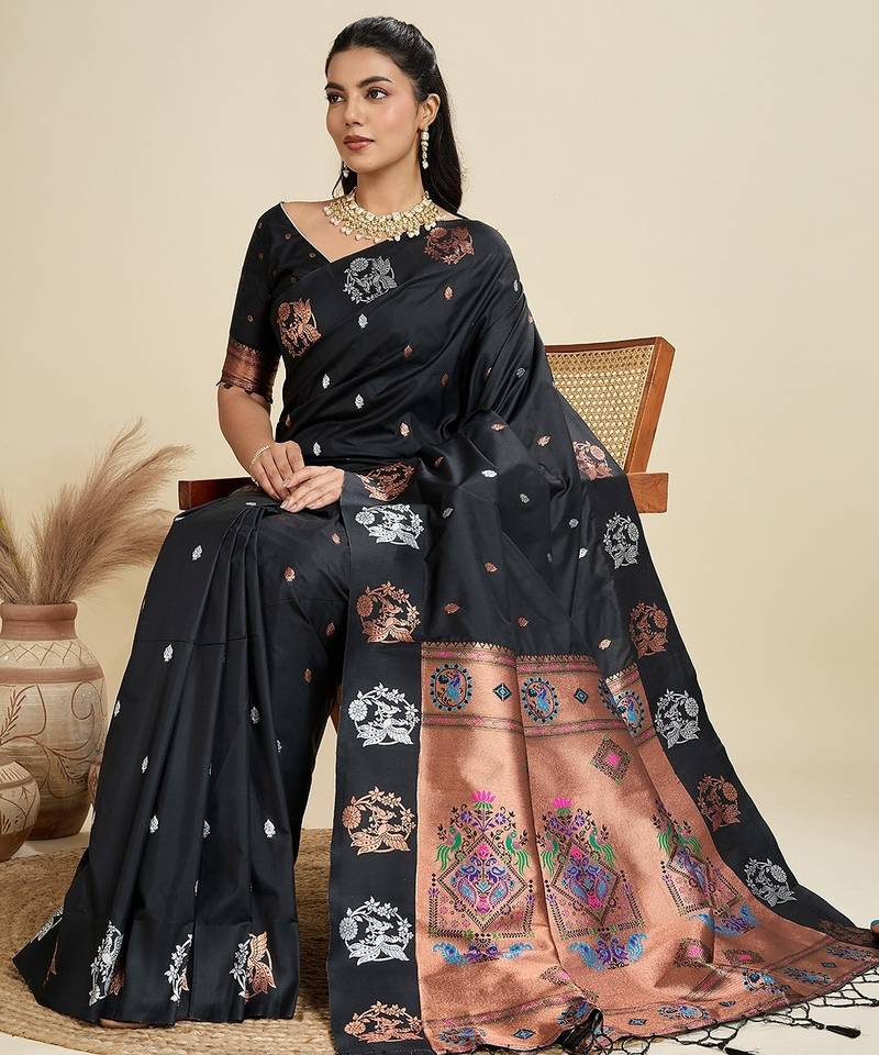 • Saree : Color- Black / Fabric- Silk Blend • Blouse : Color- Black / Fabric- Silk Blend Saree Details