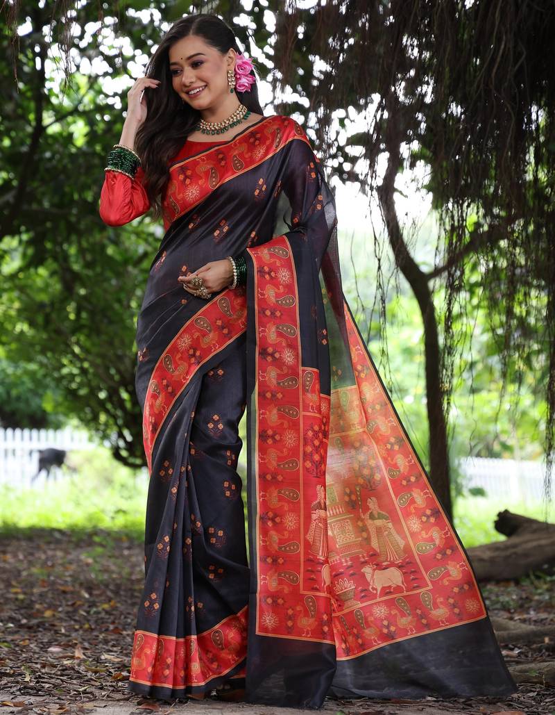 • Saree : Color- Black / Fabric- Tussar Silk • Blouse : Color- Orange / Fabric- Tussar Silk Saree Details