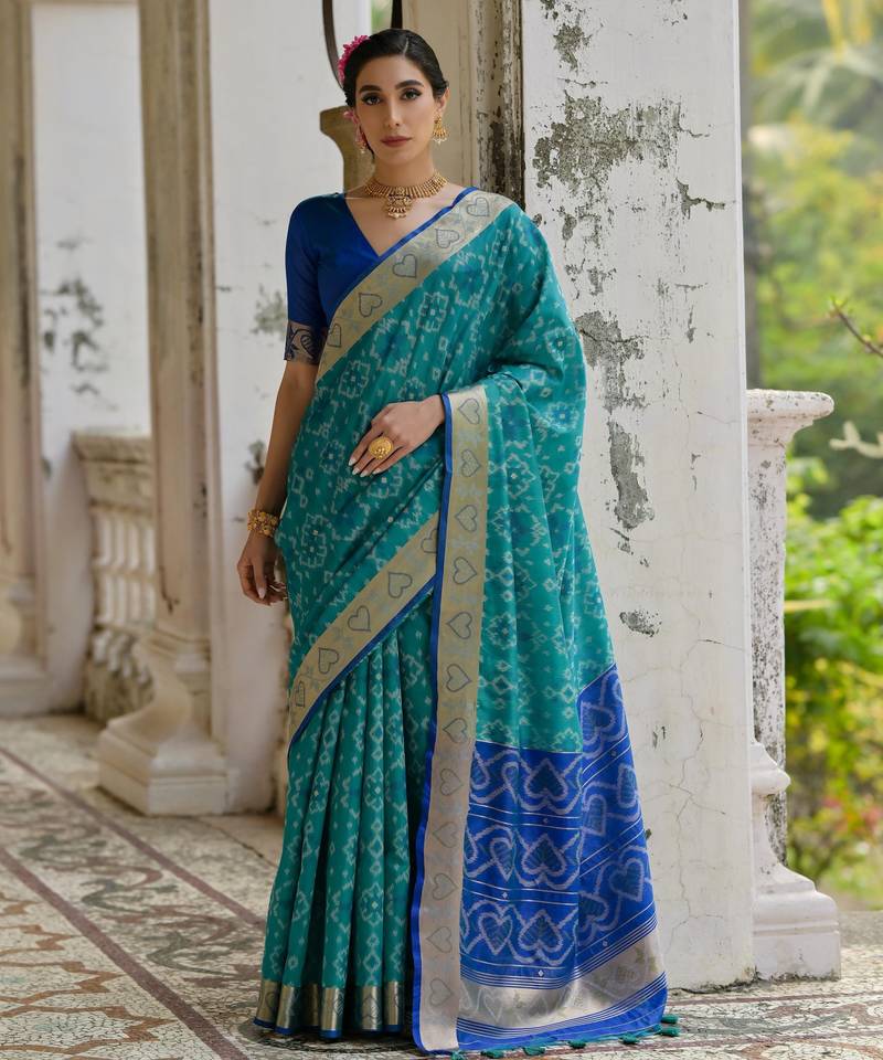 Soft Desi Raw Silk Saree with Beautiful contrast weaved Ikkat Pallu and Zari Woven Border with Fancy Tassels and Contrast Blouse Piece