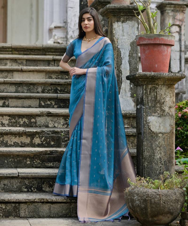 • Saree : Color- Blue / Fabric- Silk Blend • Blouse : Color- Blue / Fabric- Silk Blend Saree Details