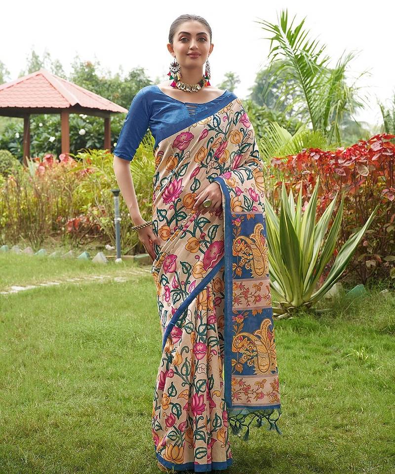 Soft Tussar silk saree with beautiful kalamkari prints with traditional printed pallu and Border with fancy tasseles with contrast blouse piece