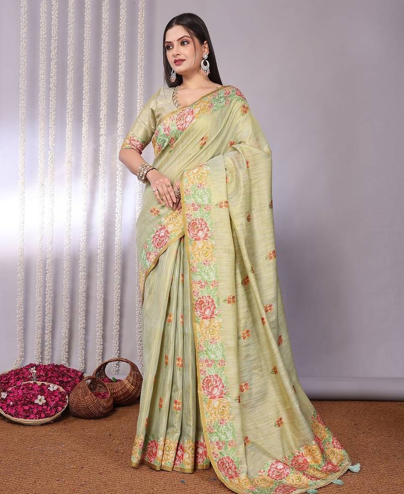 • Saree : Color- Cream / Fabric- Tissue • Blouse : Color- Beige / Fabric- Tissue Saree Details