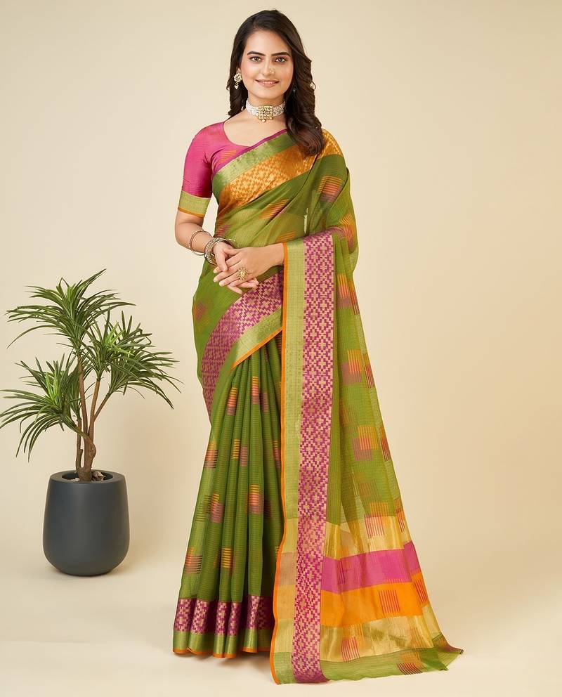 Green Chanderi Printed Saree With Blouse