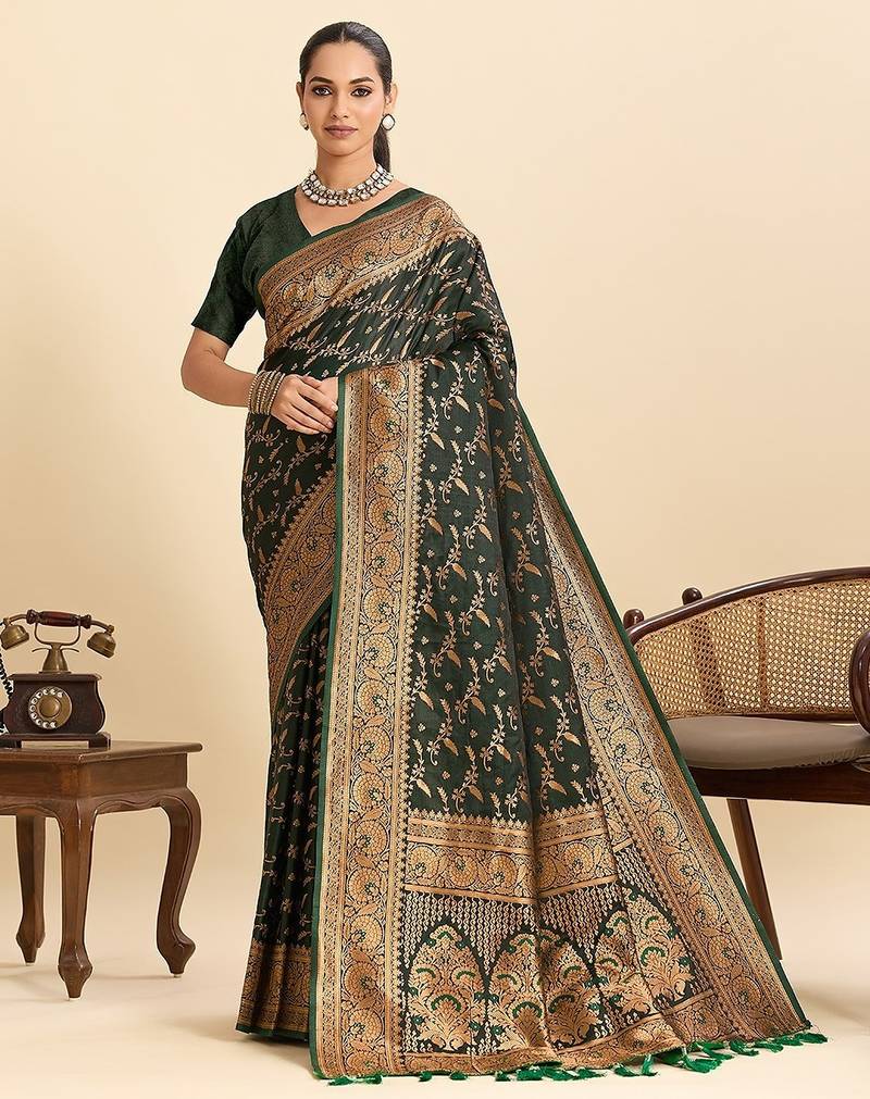 Green Satin Printed Saree With Blouse