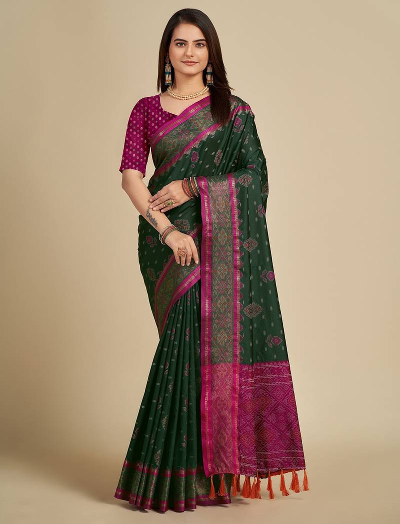 Green Silk Blend Printed Saree With Blouse