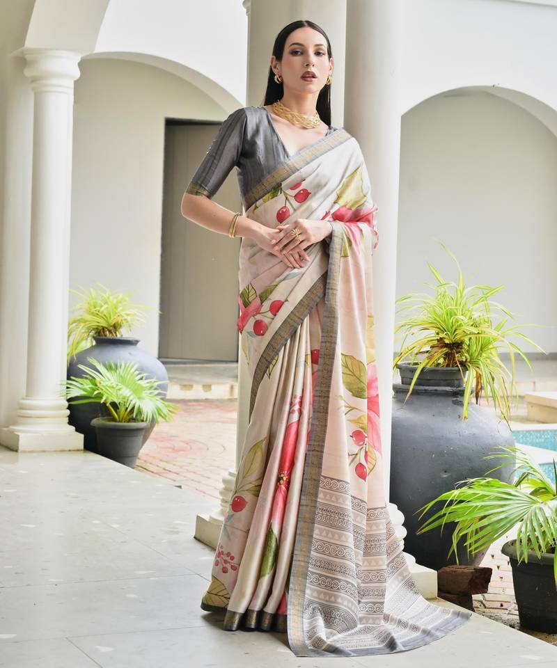 Soft Pure Satin Silk Saree with classic printed pallu and all over hand painted floral pattern with zari weaving contrast border & contrast blouse piece