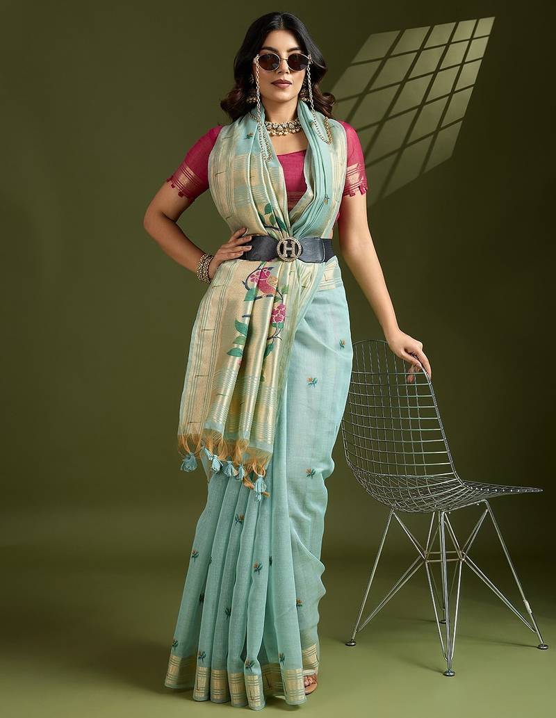 • Saree : Color- Light Blue / Fabric- Blended Cotton • Blouse : Color- Pink / Fabric- Blended Cotton Saree Details