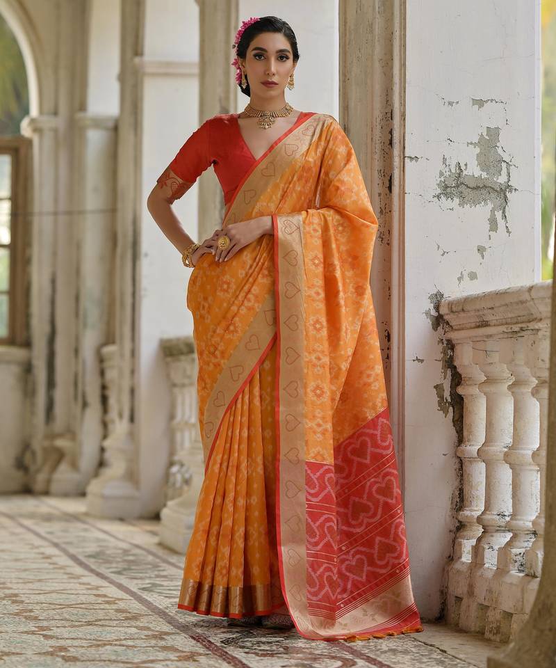 Soft Desi Raw Silk Saree with Beautiful contrast weaved Ikkat Pallu and Zari Woven Border with Fancy Tassels and Contrast Blouse Piece
