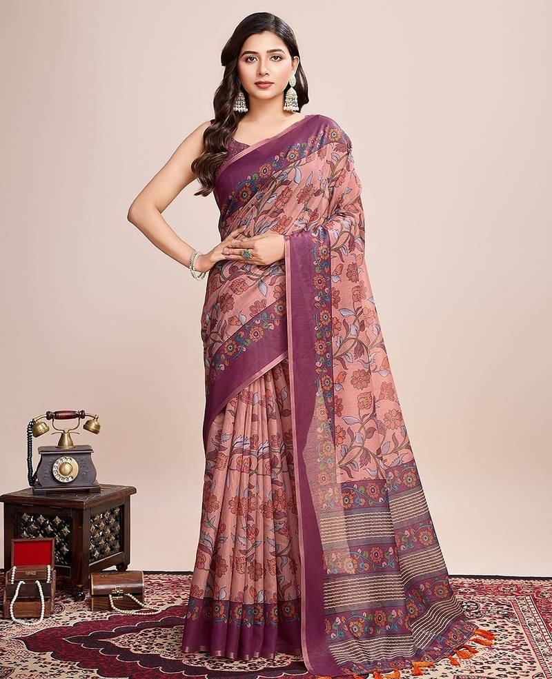 • Saree : Color- Orange / Fabric- Linen • Blouse : Color- Purple / Fabric- Linen Saree Details