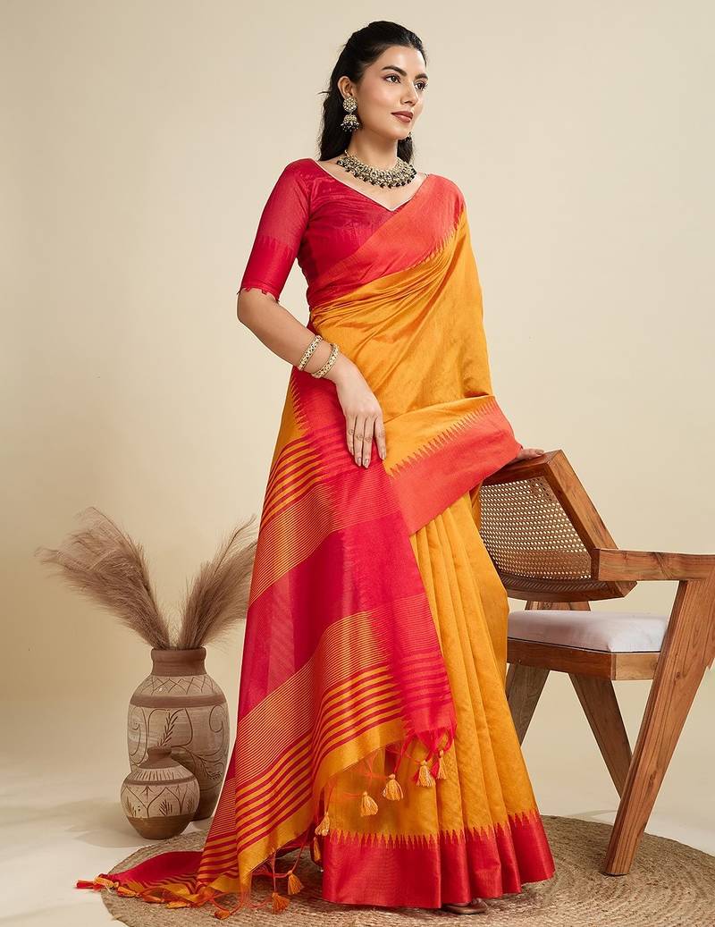 PREMIUM KHADI RAW SILK SAREE WITH TRADITIONAL CONTRAST TEMPLE WEAVING BORDER AND CONTRAST PALLU AND FANCY TASSELS WITH CONTRAST BLOUSE PIECE