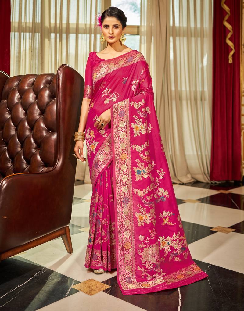 • Saree : Color- Pink / Fabric- Silk Blend • Blouse : Color- Rani Pink / Fabric- Silk Blend Saree Details