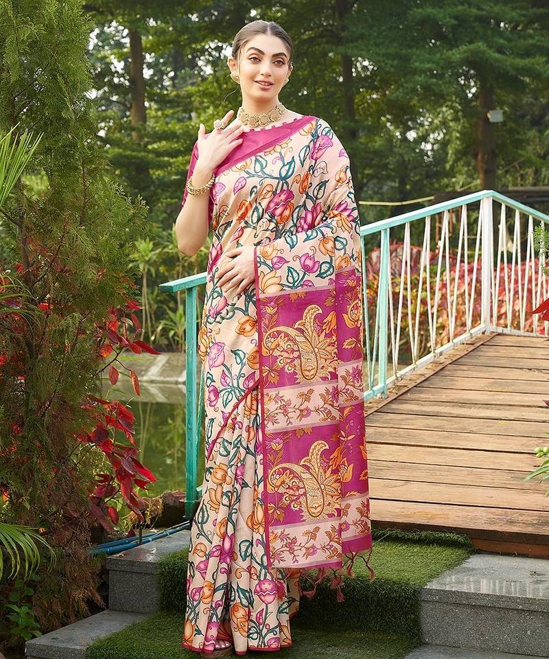 Soft Tussar silk saree with beautiful kalamkari prints with traditional printed pallu and Border with fancy tasseles with contrast blouse piece