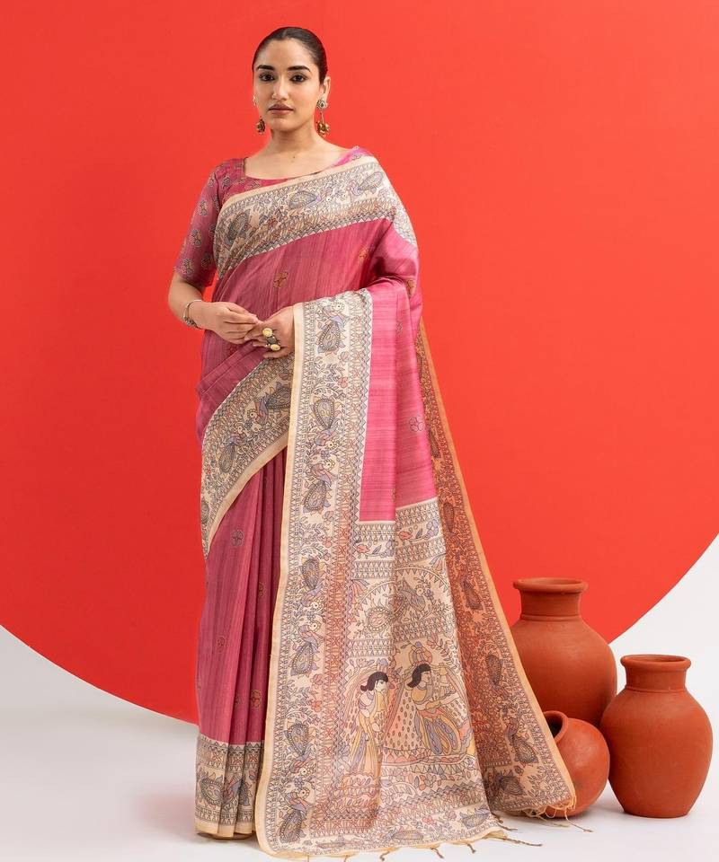 • Saree : Color- Pink / Fabric- Tussar Silk • Blouse : Color- Pink / Fabric- Tussar Silk Saree Details