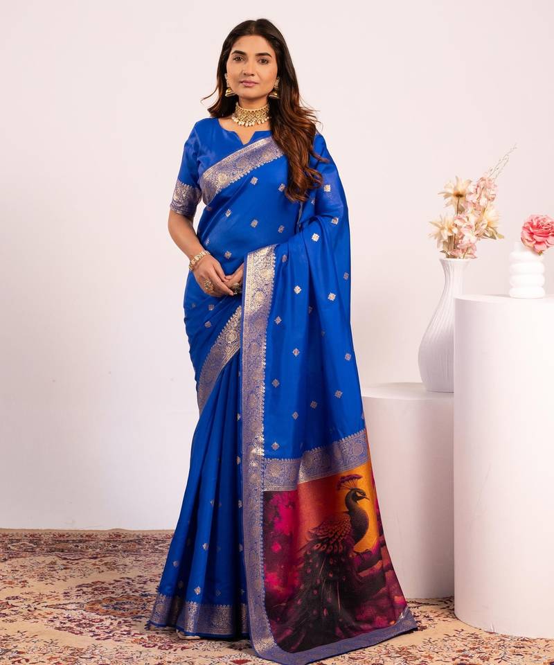 • Saree : Color- Royal Blue / Fabric- Silk Blend • Blouse : Color- Royal Blue / Fabric- Silk Blend Saree Details