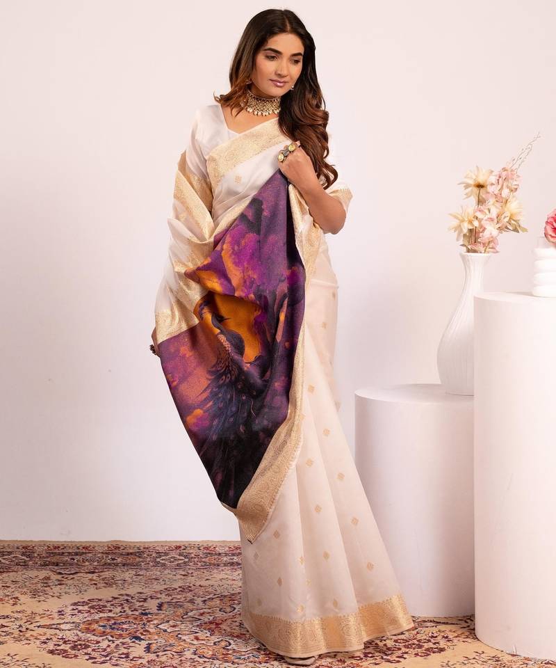• Saree : Color- White / Fabric- Silk Blend • Blouse : Color- White / Fabric- Silk Blend Saree Details