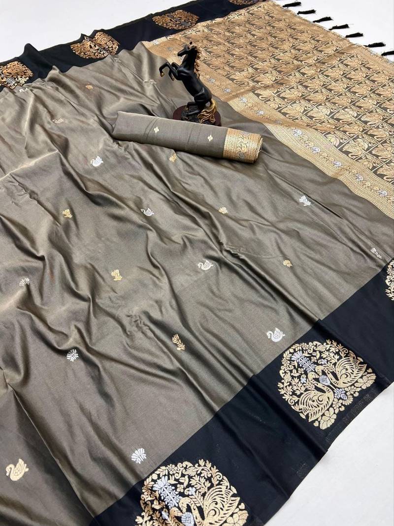 Dark Grey Soft Silk Saree With Zari Weaving & Rajhans Motifs