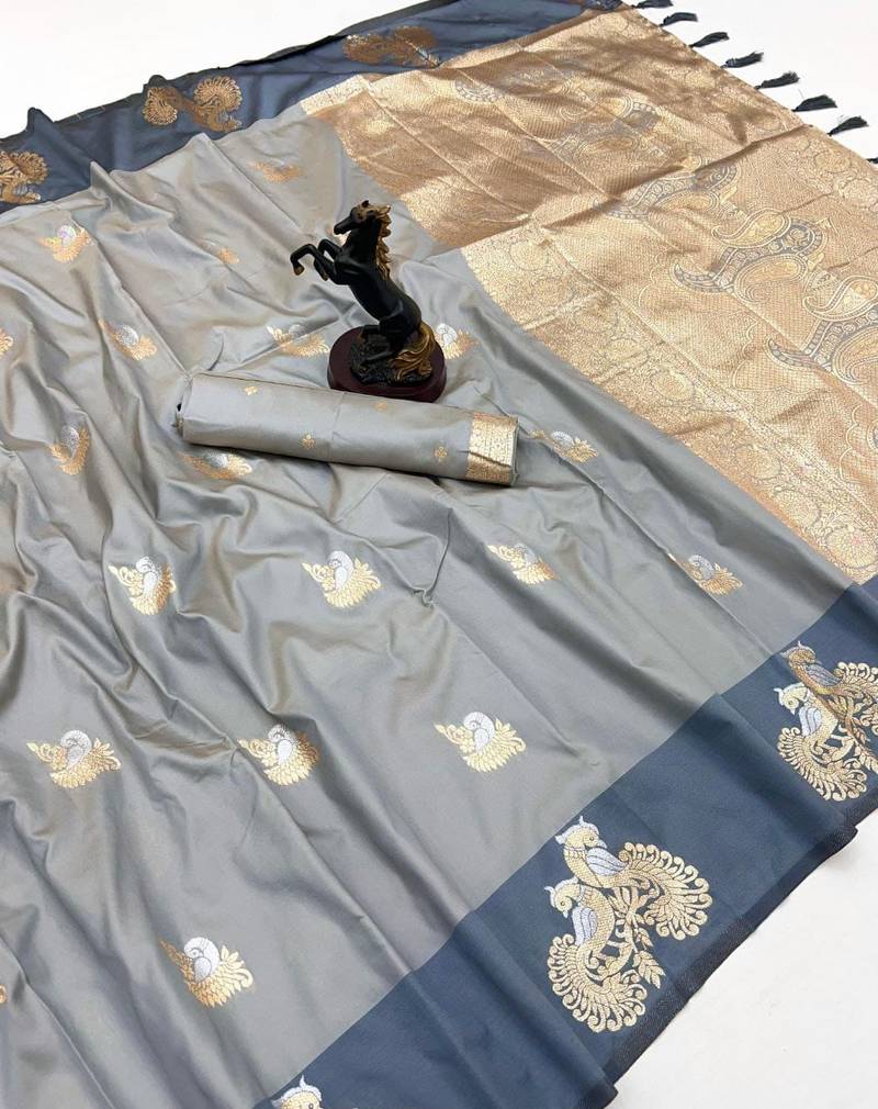 Grey Soft Silk Saree With Zari Weaving & Peacock Motifs