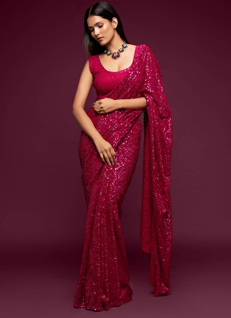 Pink Georgette Saree With Thread & Multiple Sequins Embroidery