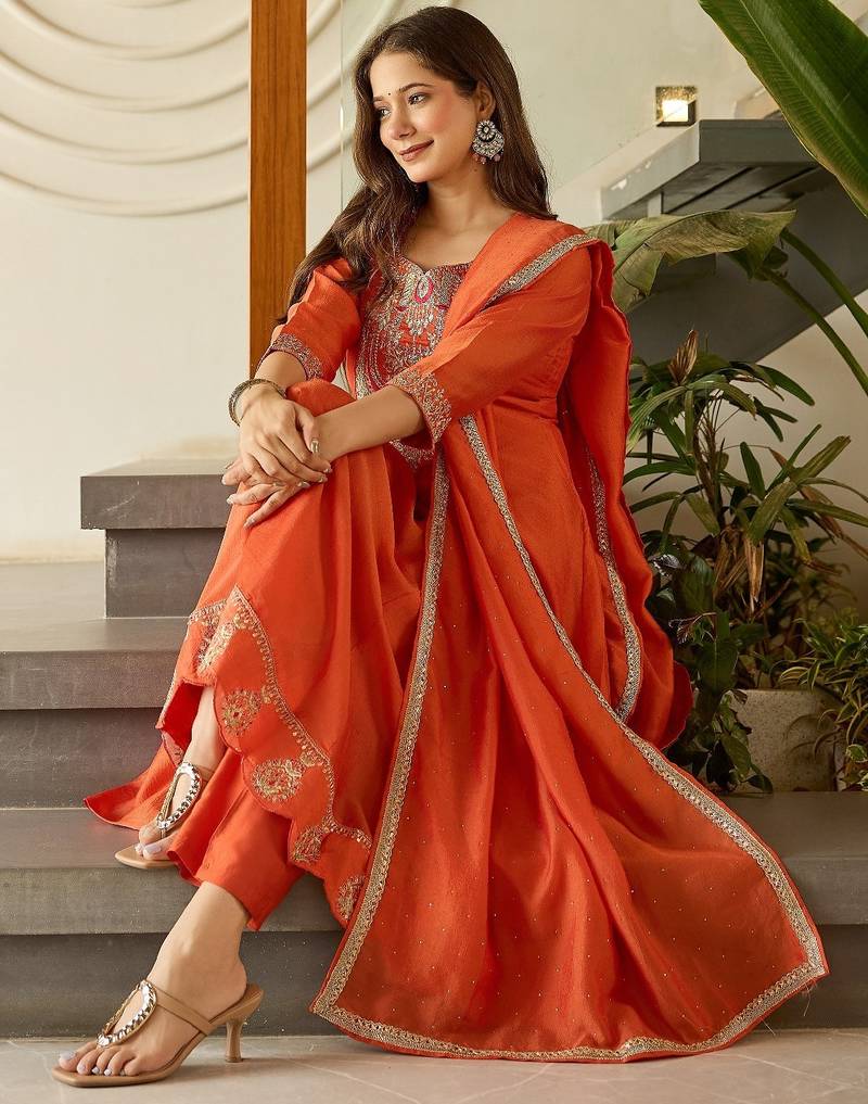 Women's Vichitra Silk Embroidered Flared Kurta with Pant And Dupatta Sets Color = Rust Size = S, M, L, XL, XXL,3XL Product Detail ➡ Kurti = Stiched ➡ Kurti Material = Vichitra Silk ➡ Work = Embroidered ➡ Bottom = Stiched ➡ Bottom Material = Rayon ➡ Dupatta = Stiched ➡ Dupatta Material = Vichitra Silk ➡ Dupatta Length = 2.10 Meter