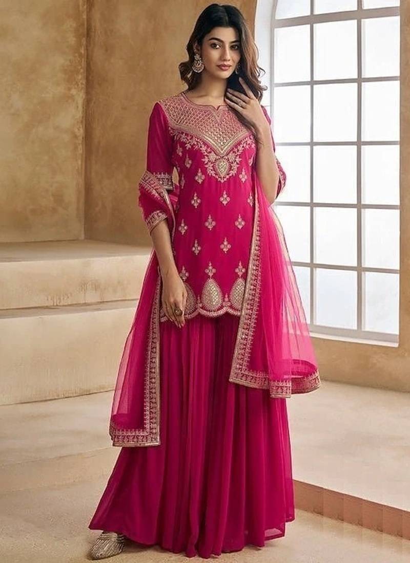 • Product Id : 4707923 • Package Details : 1 Kurti/ 1 Pant/ 1 Dupatta • Type : Kurta Sets • Occasion : Party Wear • Fabric : Georgette • Work : Embroidered • Type : Aari Work • Look : Designer • Sleeve : Half Sleeve • Neck Style : V Neck • Color : Rani Pink • Stitching : Stitched Payments [+]