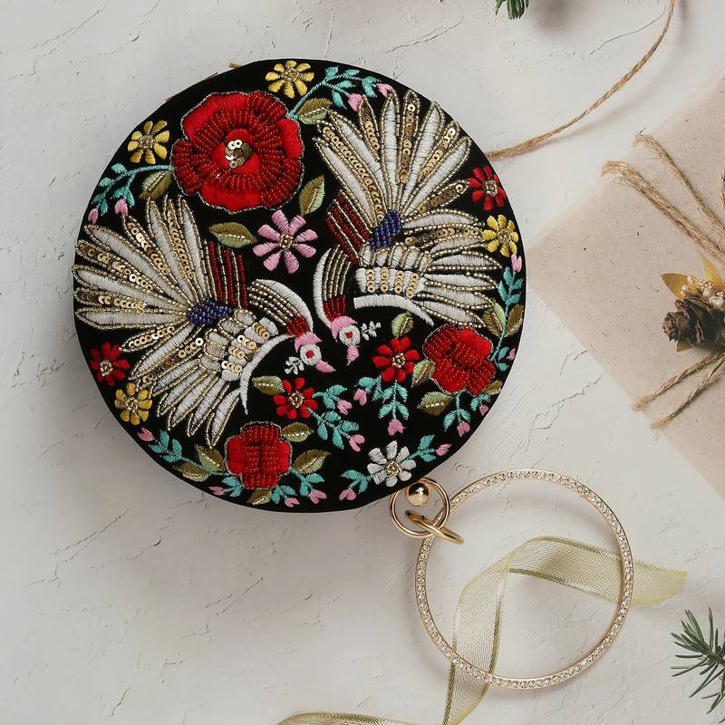 Worthyy Enterprises Embroidered Women's Round Shape Clutch (Black)