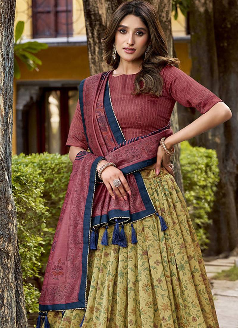 • Style : Circular Lehenga • Fabric : Silk • Work : Printed • Color : Olive Dupatta Details