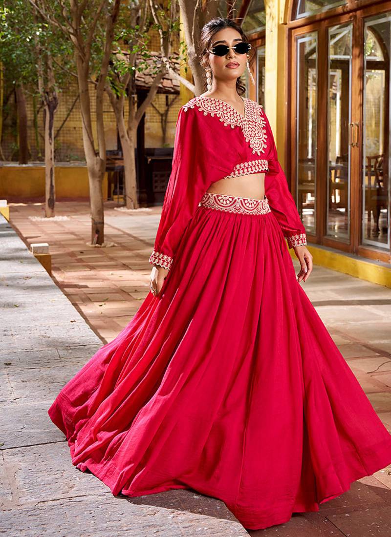 Pink Vichitra Silk Crop Top Lehenga With Detailed Thread Embroidery